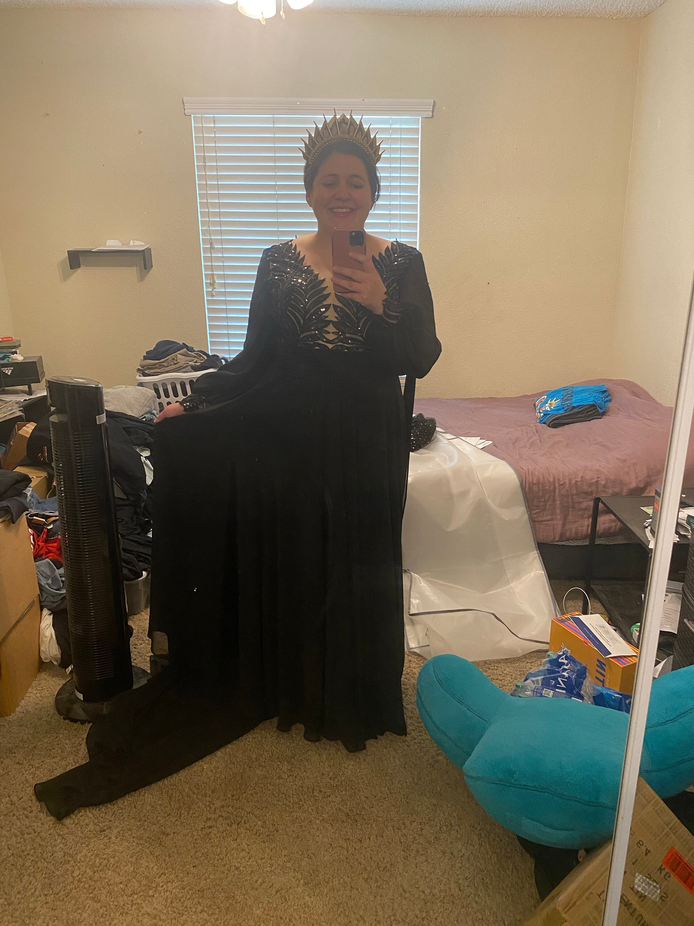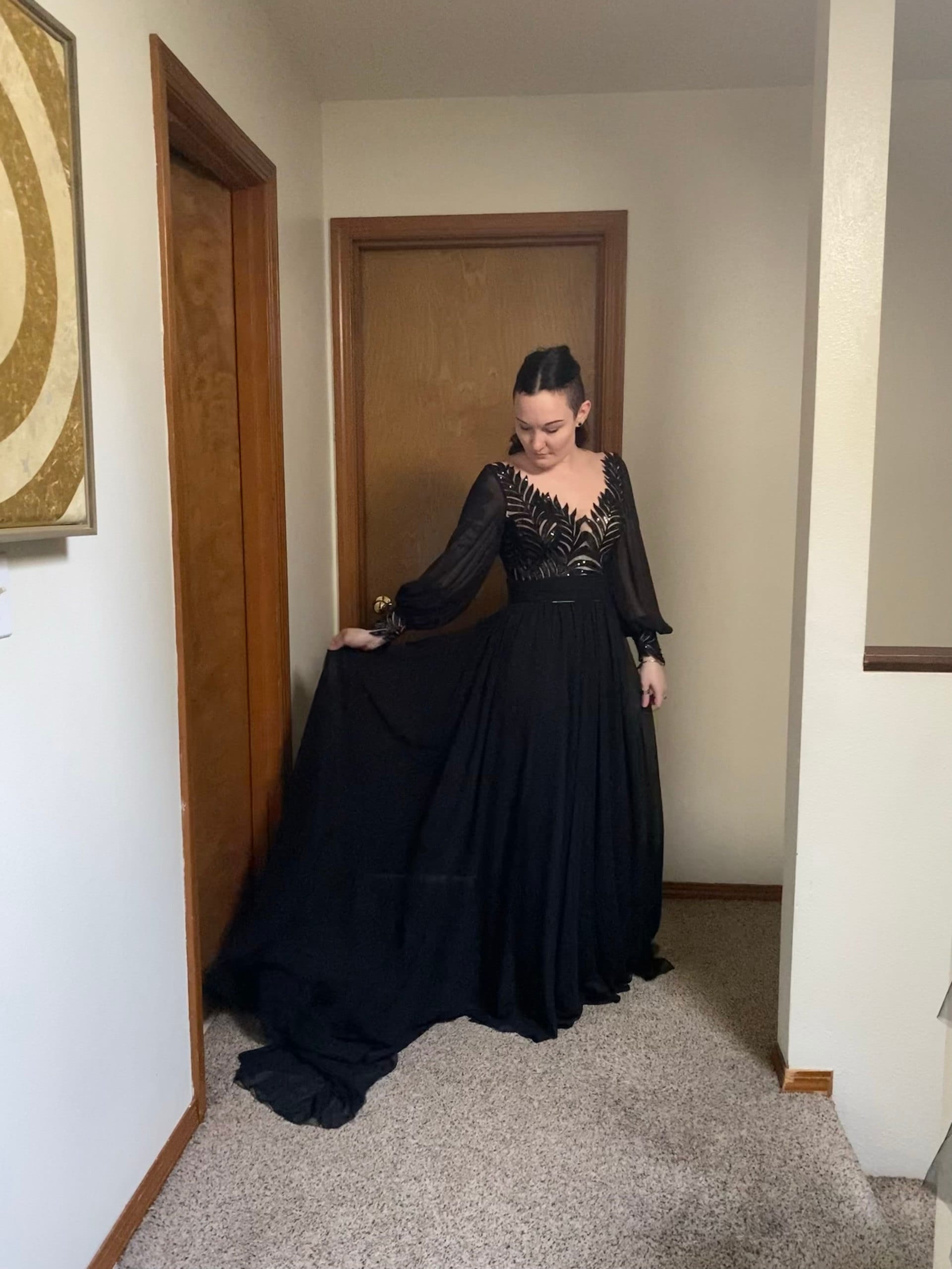 I looked at this dress for months, even before my engagement. And I’m telling you it won’t disappoint, it’s beautiful and unique. Gorgeously well made, and arrived in less than a month upon ordering. I made a few changes to the original pattern, Larisa made my dark queen wedding dress dreams come true.