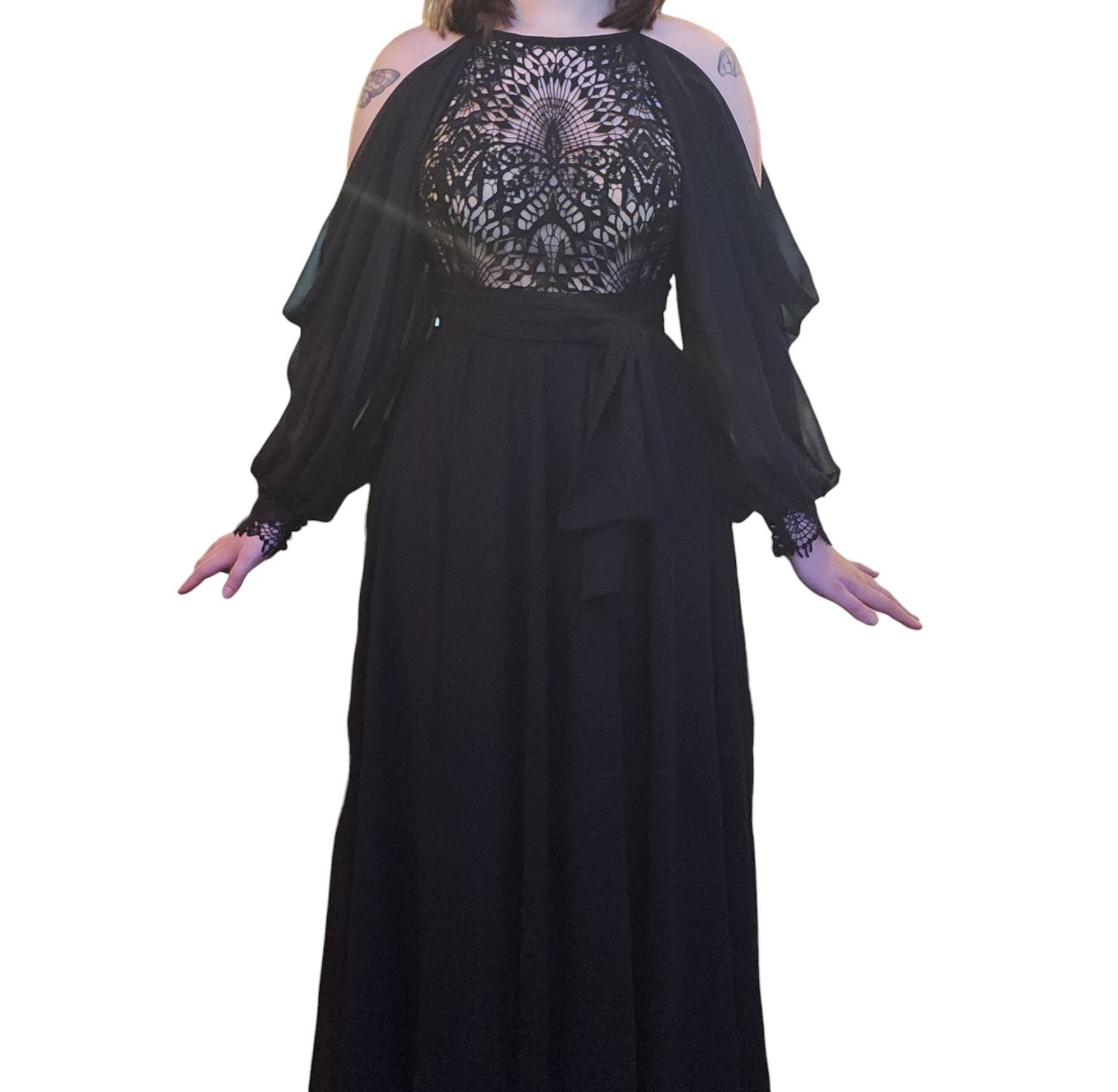 Wedding dress in Boho style. The dress is made of chiffon and lace, the lower part of the dress on a transparent corset is decorated with lace at the top, the lace open back looks beautiful. Off-the-shoulder chiffon sleeves draw attention. Tropezia-cut skirt with two front slits. dress size 7 . chest / 36,5. inch / waist 30. inch / hip 39. inch. It is also possible to order according to individual measurements. In the presence of two colors black and white.